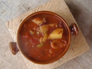 - Amikor a hús majdnem puha, beletesszük az erős paprikát, a felkockázott burgonyát és a feldarabolt zöldbabot. Ízlés szerint felöntjük vízzel (ki-milyen sűrű levest kíván készíteni), ha szükséges fűszerezzük, és készre főzzük.