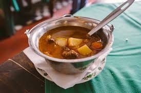 - Amikor a hús puha, beletesszük a sárgarépát, majd amikor forrt egyet, mehet bele a krumpli is. Ennek a tetejére szórunk egy evőkanál fűszerpaprikát, majd felöntjük vízzel (hagyjuk, hogy a paprika főzés közben keveredjen el, ne kevergessük). Készre főzzük.